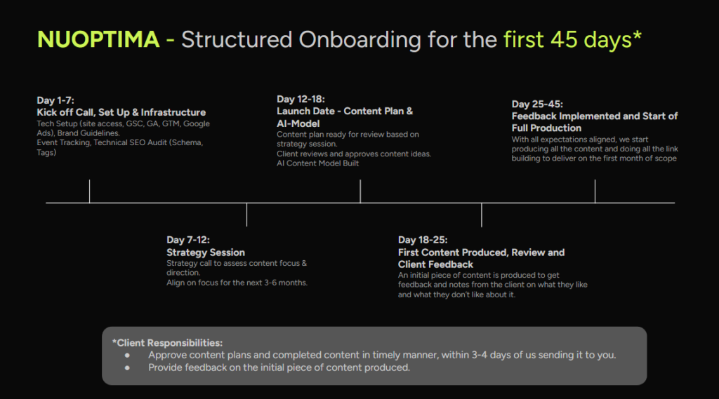 - Establish Data Infrastructure: Secure access and configure tracking across GA4, Google Search Console, and Looker Studio to ensure data transparency and accurate attribution.