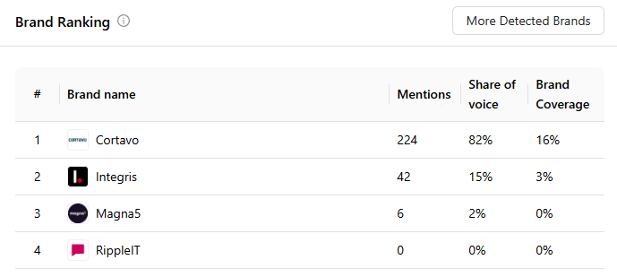 Alt text: Brand ranking table showing mentions, share of voice, and brand coverage, with Cortavo leading with 224 mentions (82% share of voice, 16% coverage).