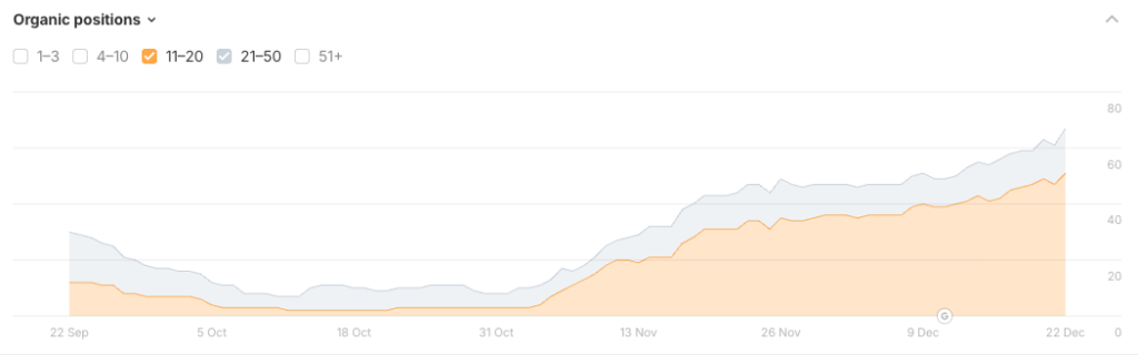 Alt text: Area chart of organic keyword positions (Sep–Dec) showing 11–20 and 21–50 rankings dipping in early October, then rising sharply from early November and continuing upward through late December.