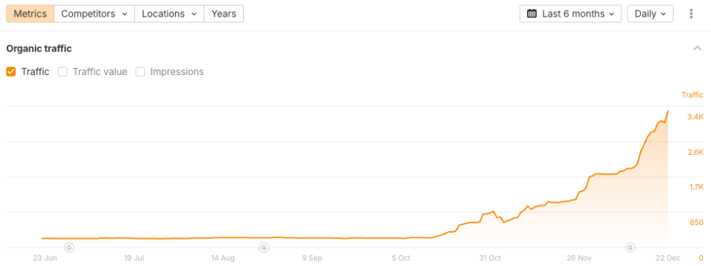 1) Organic traffic growth (last 6 months): The traffic trend stays flat through the early period, then inflects sharply in late October and climbs steadily through November and December—finishing near the top of the visible scale (~3.4K in the chart).