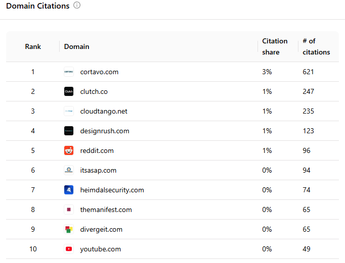 Across tracked prompts relevant to Cortavo’s services, Cortavo became the most consistently cited domain, meaning AI tools referenced cortavo.com far more often than competitors when generating recommendation-style answers.
