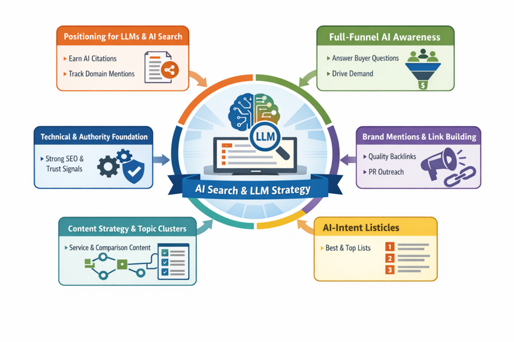Alt text: Infographic showing an “AI Search & LLM Strategy” hub with six pillars: technical SEO, topic clusters, AI-intent listicles, link building, AI awareness, and LLM positioning.
