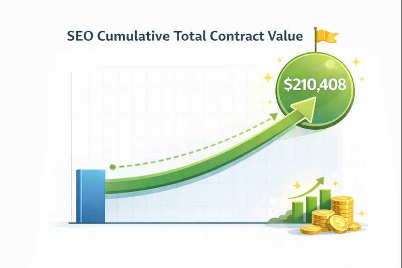 Alt text: Illustration titled “SEO Cumulative Total Contract Value” showing an upward green arrow ending at a large green circle labeled $210,408, with coins and a small rising bar chart in the bottom-right.