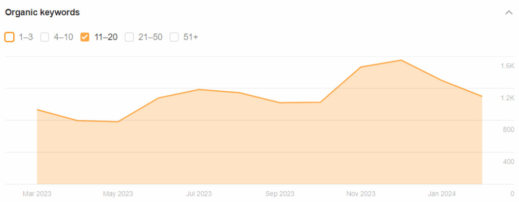 In einem anderen Segment stabilisierten sich die Positionen 11 bis 20 bei 1.200 bis 1.600, wobei die allmählichen Verbesserungen auf Optimierungen des Bottom-Funnel zurückzuführen waren. Diese Kennzahlen, die aus den Leistungsgrafiken in unseren Berichten stammen, unterstreichen, wie unsere Strategie nicht nur die Reichweite vergrößert, sondern auch die Relevanz und das Konversionspotenzial der eingehenden Besucher verbessert.