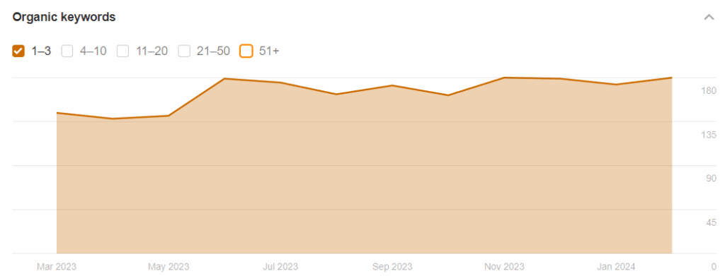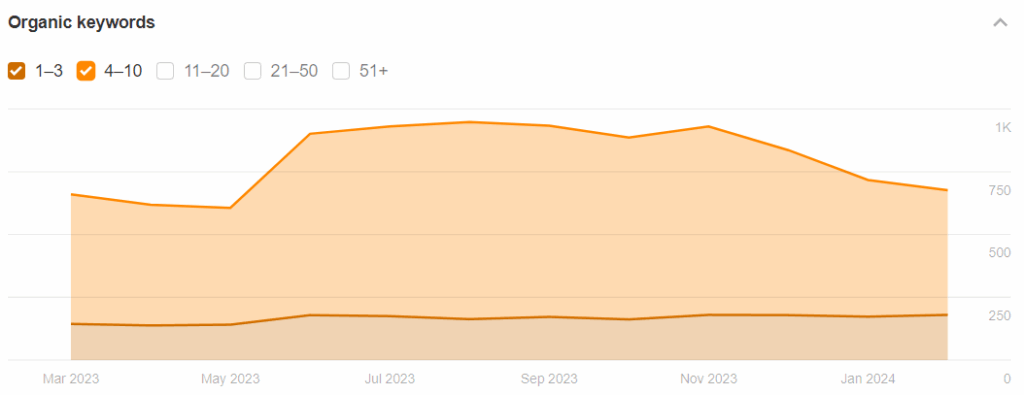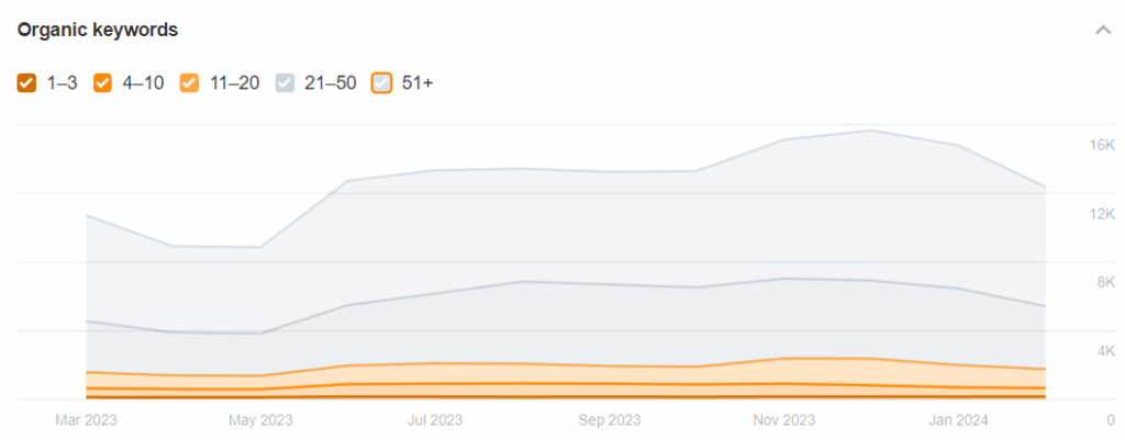 Zur weiteren Veranschaulichung der Auswirkungen haben wir die wichtigsten SEO-Kennzahlen aus den monatlichen Berichten analysiert, einschließlich der organischen Keyword-Rankings im Zeitraum von März 2023 bis Januar 2024. Die Gesamtzahl der organischen Keywords zeigte eine stabile und gezielte Verbesserung und schwankte zwischen etwa 12.000 und 16.000, mit einem Spitzenwert um die Jahresmitte 2023, der die Einführung unserer Content-Initiativen widerspiegelt. Während das Gesamtvolumen stabil blieb, gab es Verschiebungen hin zu höherwertigen Rankings, mit Rückgängen bei Keywords mit niedrigeren Positionen (51+) und Zuwächsen bei mittleren Positionen (11-50), was auf eine bessere Sichtbarkeit für konversionsorientierte Begriffe hinweist.