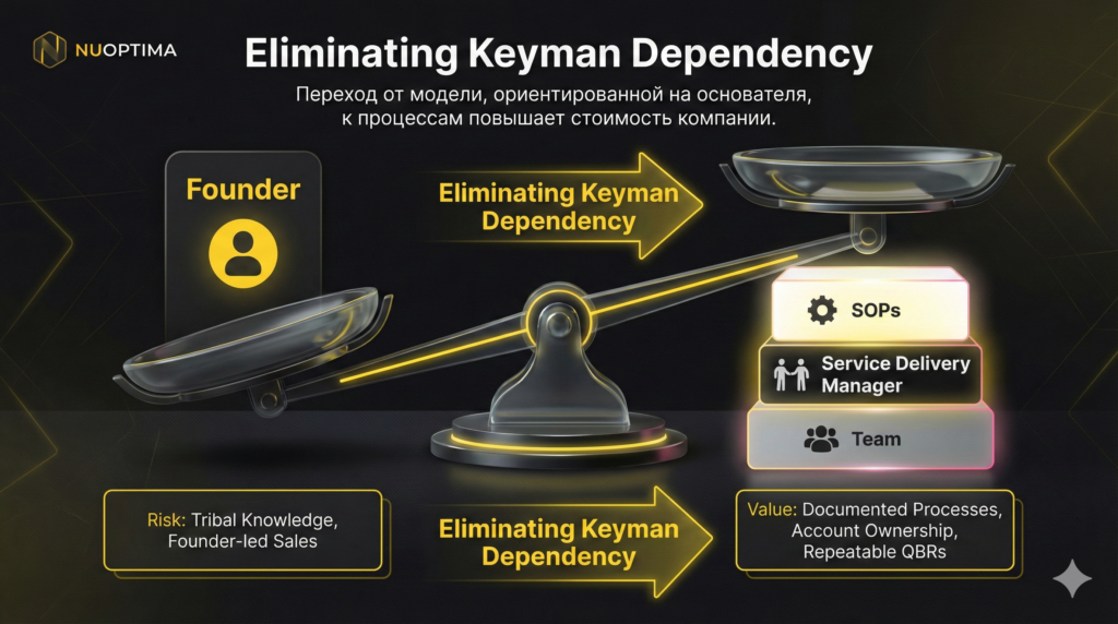 - Eliminate Keyman Risk. Map all critical founder roles (Sales, Engineering oversight) to new internal owners and execute documented knowledge transfer. [Item 3] Outcome: Achieve a repeatable, clean monthly close process and a defined M&A thesis.