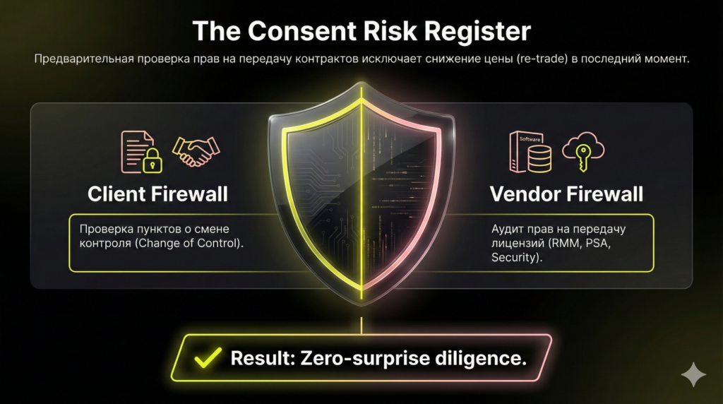 - Audit key vendor agreements (PSA, RMM, Security Stack) for transferability and renewal schedules. Create an action plan to secure required consents immediately. Outcome: Develop a zero-surprise Consent Risk Register.