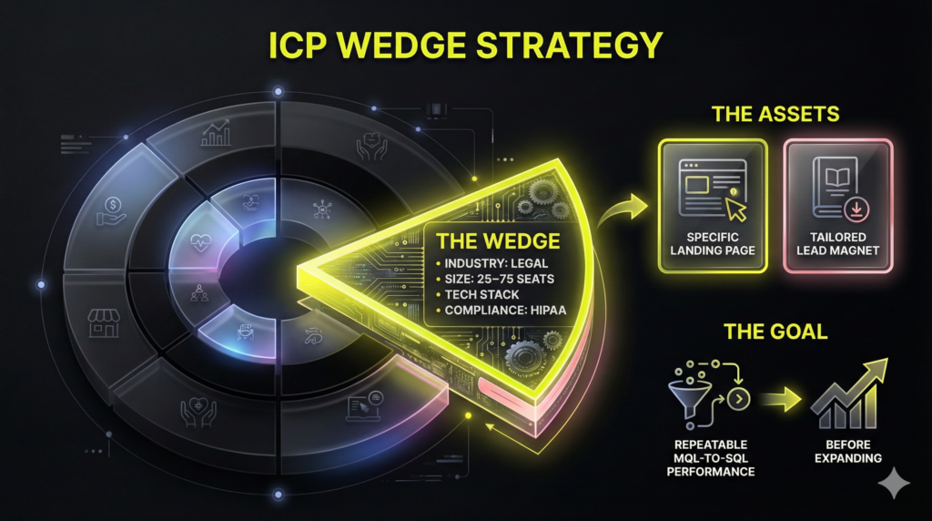 To gain immediate traction, select one narrow ICP wedge: one primary vertical plus a key buyer persona (e.g., Law Firms, 25-50 seats, targeting the Managing Partner).
