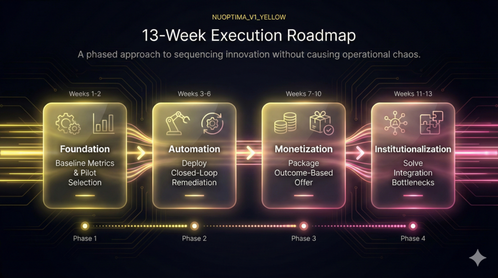 Adopting concurrent major technology shifts causes operational chaos and tool sprawl. Achieve compounding wins and maximize M&A readiness by sequencing innovation with a pilot-first approach. This 13-week schedule ensures automation investments deliver auditable improvements in unit economics and gross margin, securing investor-grade revenue outcomes.
