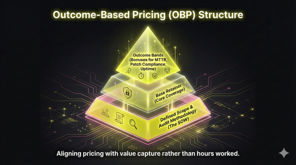 The fix is transitioning to outcome-based pricing (OBP) to align incentives with the value of automated delivery. Structure contracts scalably: a fixed base retainer ensures coverage, supplemented by outcome bands tied directly to 2–4 measurable Service Level Agreements (SLAs).