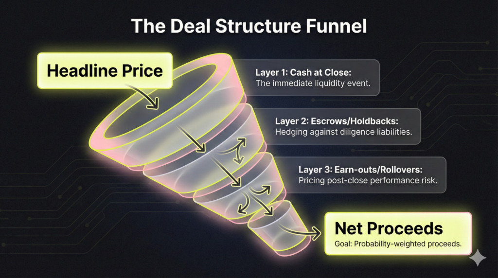 Deal structure translates the Letter of Intent (LOI) price into a binding agreement by pricing uncertainty—specifically M&A signals like churn risk and integration liability. High headline values are often conditional, relying heavily on the structure’s mechanics.