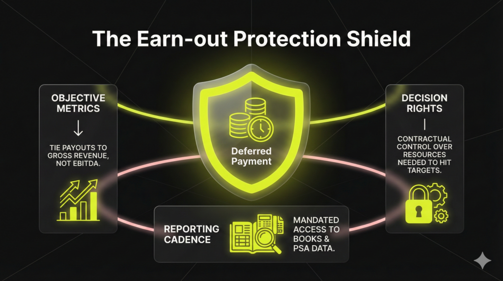 In an earn-out, the seller loses operational control post-close, yet deferred capital remains tethered to the buyer’s execution. Ambiguity silently evaporates value. Sellers must insist on defined, auditable protections. Demand objective metrics like Gross Revenue, which is far harder to manipulate than adjusted EBITDA. Mandate a strict reporting cadence, specific access to the books, and clear calculation examples written into the PSA.