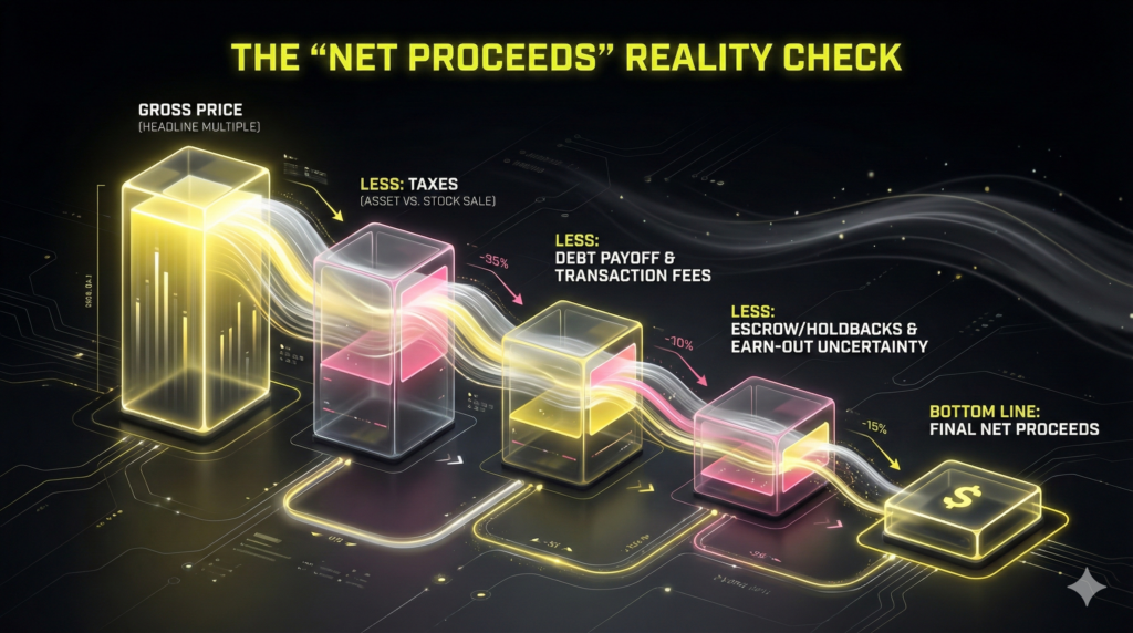 The purchase price is often conditional. Recognize the impact of earn-outs (future performance payments contingent on hitting growth metrics) and holdbacks (escrows protecting the buyer from unknown liabilities). If 20% or more of your calculated value is tied to post-close metrics, your immediate proceeds are drastically reduced. Action: Model these structural scenarios with a transaction attorney and CPA early. Never negotiate solely on the headline multiple.
