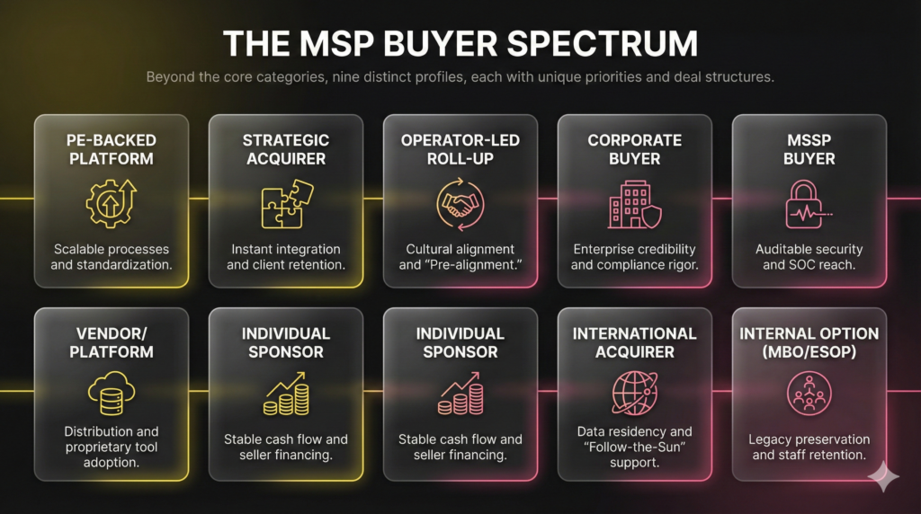 The MSP market is consolidating, yet treating all acquirers the same guarantees a valuation ceiling. The critical factor determining your exit multiple and understanding PE valuation exit mechanics is the identity of the firm across the table. Strategic failure arises from pursuing financial buyers when structured for strategic growth, or vice versa. To maximize your organic equity, founders must understand precisely who is buying msps and what they optimize for. This analysis defines nine distinct profiles, starting with the two core categories: financial buyers and strategic buyers.