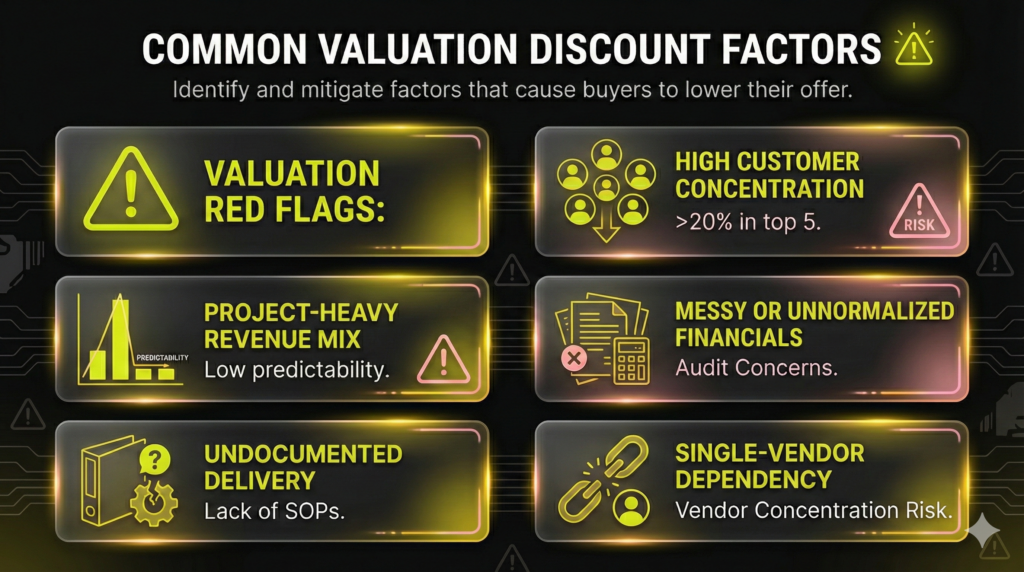 Buyers prioritize verifiable financial predictability. Primary discount factors include high customer concentration (Top 5 clients exceeding 20% of revenue), low Quality of Recurring Revenue (QRR) due to short or month-to-month contracts, project-heavy revenue that lacks predictability, and messy, unnormalized financials. Undocumented technical delivery (lack of SOPs) also acts as a significant discount, signaling high integration risk.