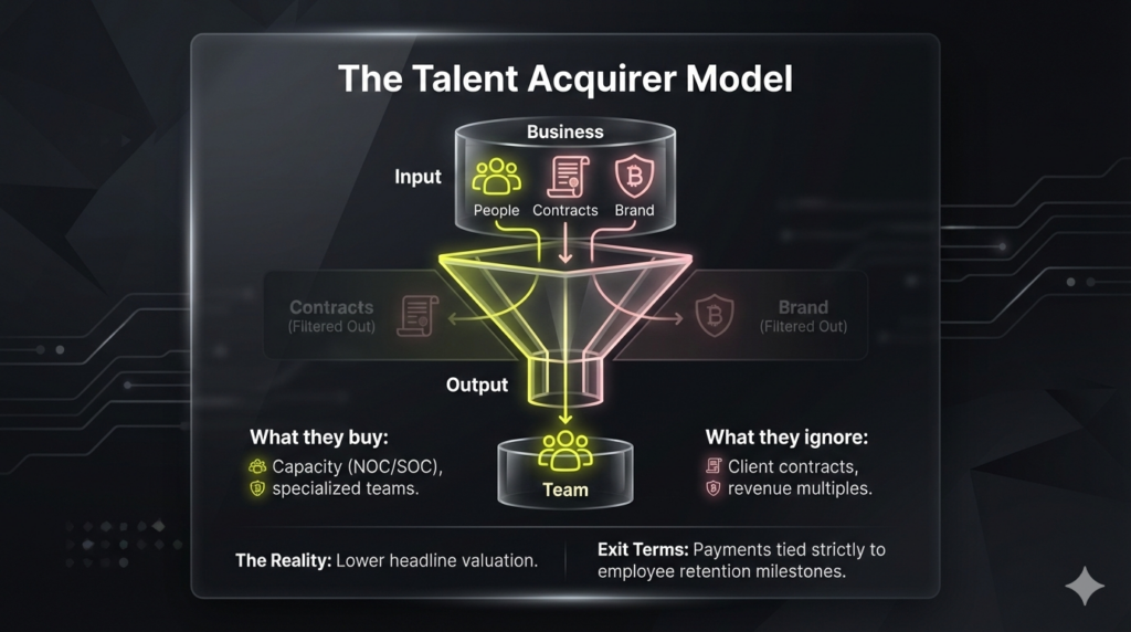When high customer concentration, weak contracts, or founder-dependent delivery undermines traditional revenue multiples, strategic list of MSP buyers pivot to the “talent acquirer” model. This segment is not interested in the client book, but in acquiring specific teams, specialized service desk capacity, or capabilities (like NOC/SOC). Diligence centers entirely on technical documentation, tool standardization, and staff retention viability before integrating the team into existing delivery frameworks. Because the primary asset is headcount, expect a lower headline valuation. Exit terms mandate retention bonuses and contingent payments tied strictly to employee retention milestones, underscoring that the sale is based on infrastructure and specialized expertise, not recurring revenue.
