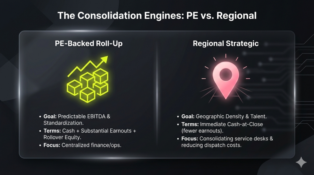 The regional strategic buyer offers a fast, practical exit, often prioritizing immediate cash-at-close over complex earnouts. This segment includes established MSPs ($10M–$50M revenue) acquiring smaller firms in contiguous markets to achieve geographic density and reduce dispatch costs.
