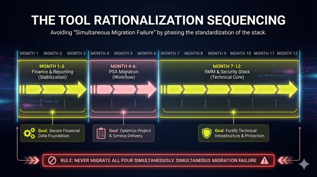 This transition impacts technician experience (morale/productivity), vendor costs, and SLA delivery during migration. To manage risk, define sequencing aggressively. Never migrate PSA, RMM, core security, and billing platforms simultaneously—that combination guarantees client friction and service failure.
