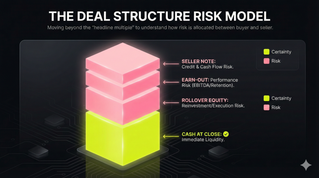 Negotiating only the headline multiple misses the point. Deal structure is the risk allocation model: it defines who finances whom and what performance you are paid to deliver post-close.