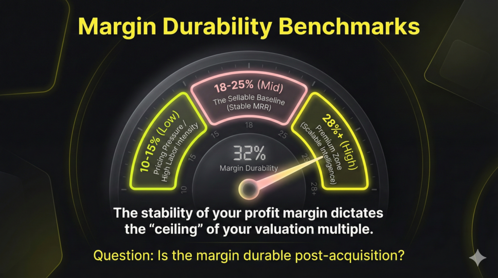 - Mid Margin (18%–25%): The “sellable” baseline, indicating recurring revenue stability and fundamental operational hygiene.