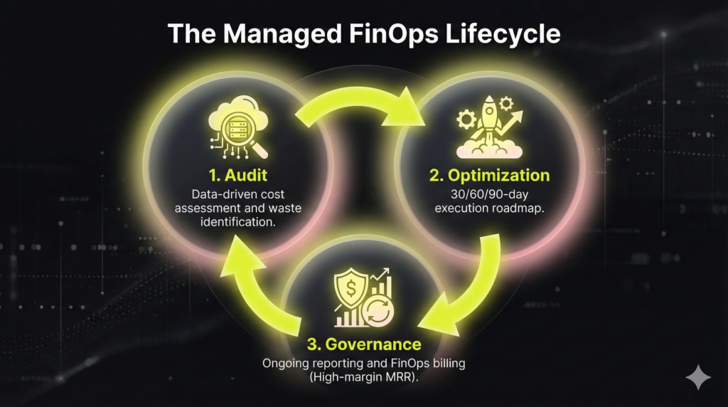 - Managed FinOps Cadence: Ongoing reporting and governance billed as high-margin MRR.