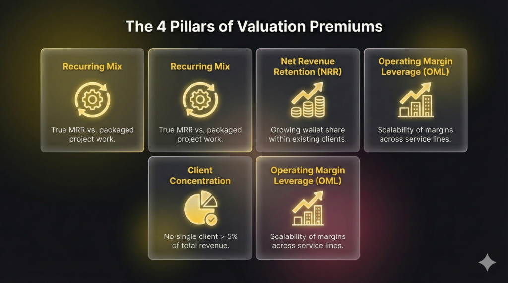 Buyers focus on non-financial operational risk factors. Critical scrutiny areas include contract defensibility, Net Revenue Retention (NRR) and churn data integrity, customer concentration metrics, evidence of standardized playbooks/SOPs, tooling standardization across the client base, and the depth of the leadership team beyond the founder. Weakness in these areas maps directly to risk, resulting in lower valuations, earnouts, or price holdbacks.