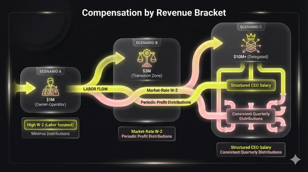 The W-2 salary covers the required labor component; distributions are the tax-advantaged extraction of net profit. Grounding the salary in market data fortifies your tax position and ensures reported EBITDA accurately reflects the true cost of management overhead.