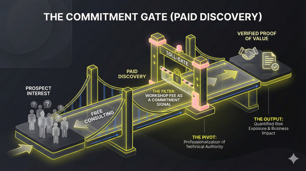 To protect your margin and filter for committed buyers, default to paid discovery. While a free, high-level introductory call is appropriate, in-depth technical analysis and strategy require professional valuation. Charge a fixed fee for the discovery workshop and credit that fee toward the first invoice if the prospect signs a contract. This transforms your technical expertise into a valued asset and ensures the client is serious about closing the solution gap. (Refer to Section 5: Engineer Paid Discovery).