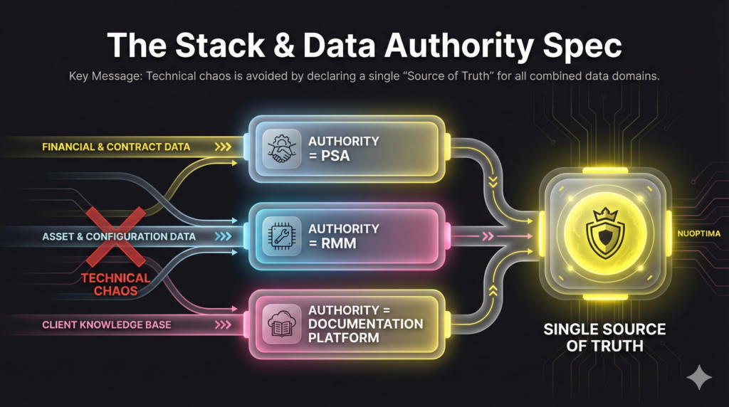 - Declare the Stack and Data Authority. Commit to the superior platform for PSA, RMM, and Documentation. Declare the canonical source of truth for core asset, financial, and configuration data (Item 5).