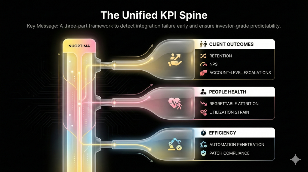 Standardize financial reporting immediately. Track transition costs (training, migration partners) against realized savings (consolidated licenses) to prove synergy realization. Establish a mandatory monthly margin leakage review to isolate unbilled time, contract mismatches, tool overlap, and discount creep. This produces one combined KPI pack leadership can trust for long-term EBITDA stability.