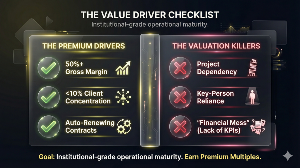The exit goal is simple: eliminate controllable risk before the LOI. Actively managing these levers allows you to dictate why your firm commands a top-tier multiple, not just ask for one.
