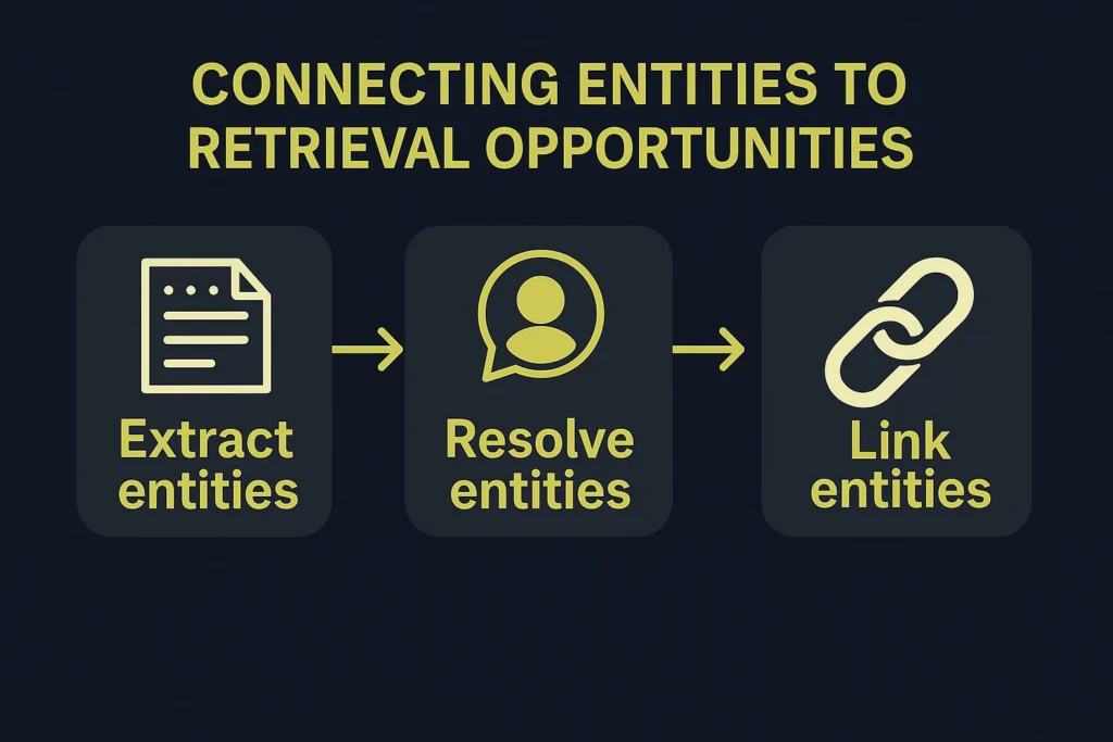 You’ll need to extract entities from your queries and your pages, resolve them to canonical IDs (like Knowledge Graph entries), and then link them with schema markup, internal links, and contextual mentions. This ensures AI systems clearly connect your content to the right entities.