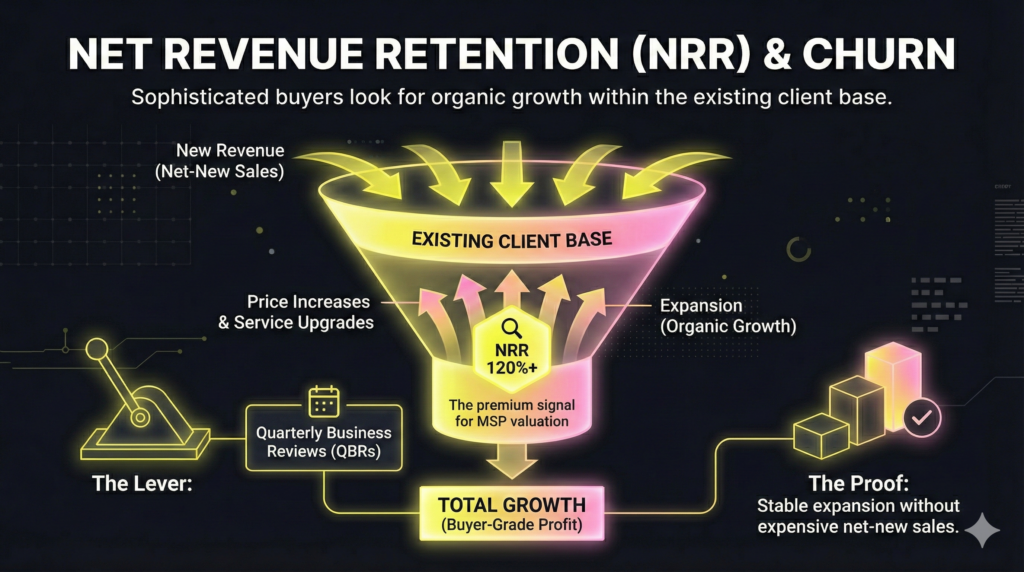 You cannot outgrow bad retention. For the sophisticated buyer, customer churn is simply revenue walking out the door; Net Revenue Retention (NRR) is the revenue kept plus revenue expanded. This metric signals a premium msp valuation because low churn indicates a sticky service and strong account management.