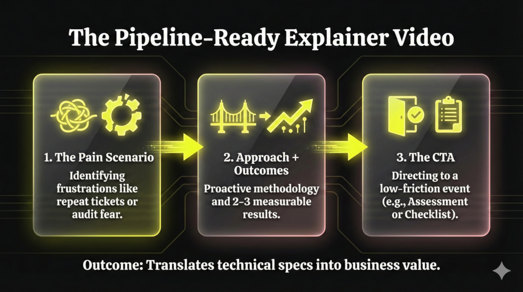 MSPs cripple pipeline velocity when sales calls start with explaining the process. The Explainer Video executes that crucial digital handshake, shrinking time-to-conversion and boosting M&A readiness by establishing baseline trust before the demo.