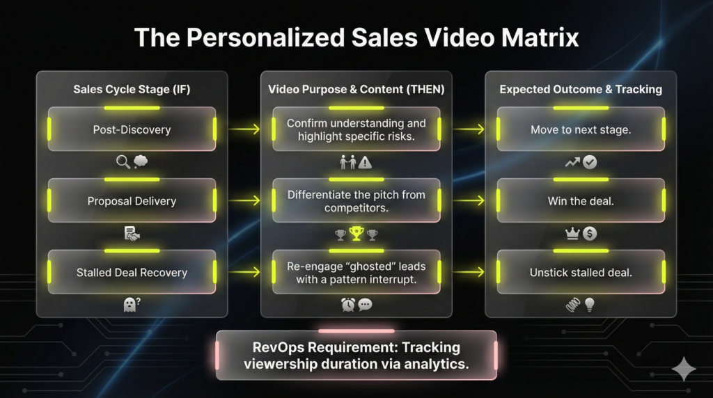 Highest ROI videos are deployed at high-leverage junctures: following first discovery (to confirm understanding), sending the official proposal (to differentiate the pitch), or recovering deals stalled post-discovery. Success requires context-specificity and strict time-boxing, kept under two minutes.